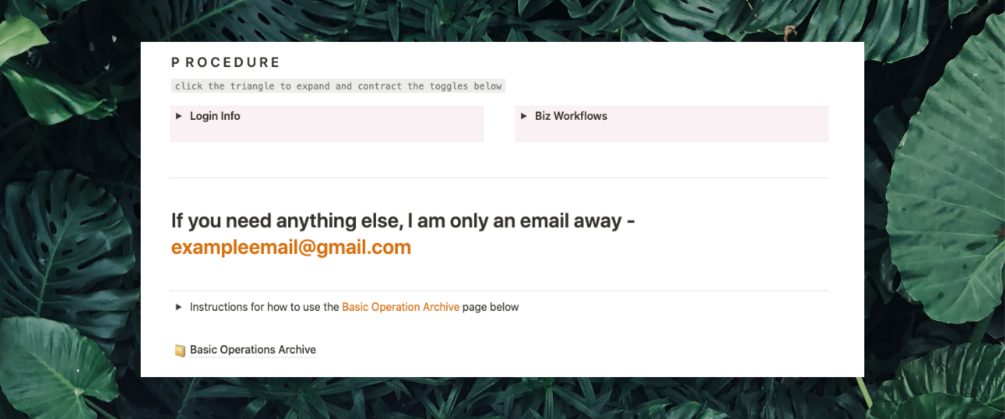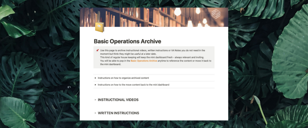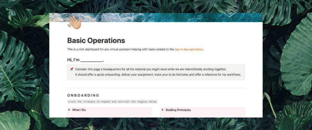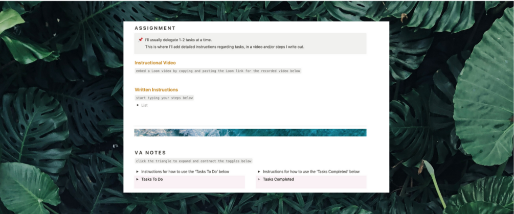 - Within each mini dashboard there are six sections to: introduce to you and your work, onboard the assistant, communicate the work you need help with (aka the assignment), allow the assistant to track their work, reference your general procedures and archive anything relevant.